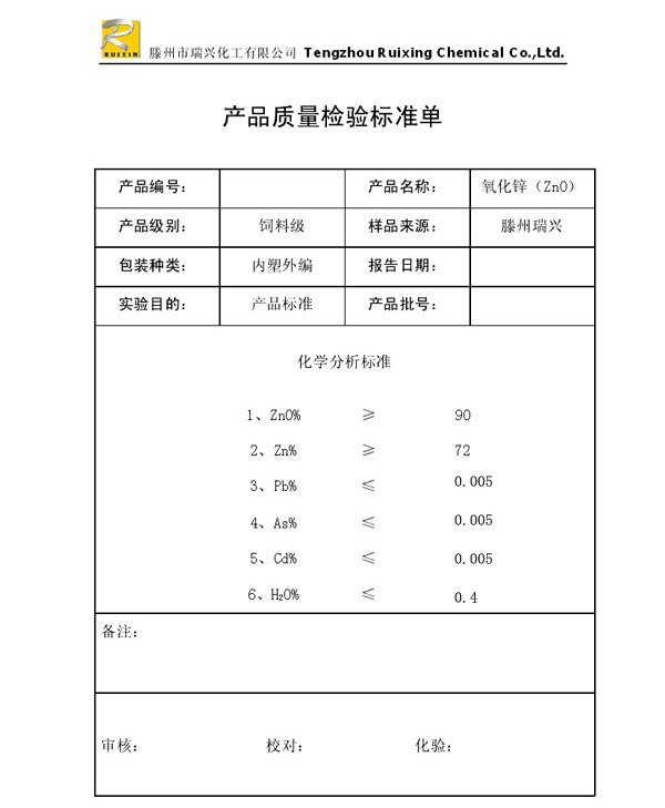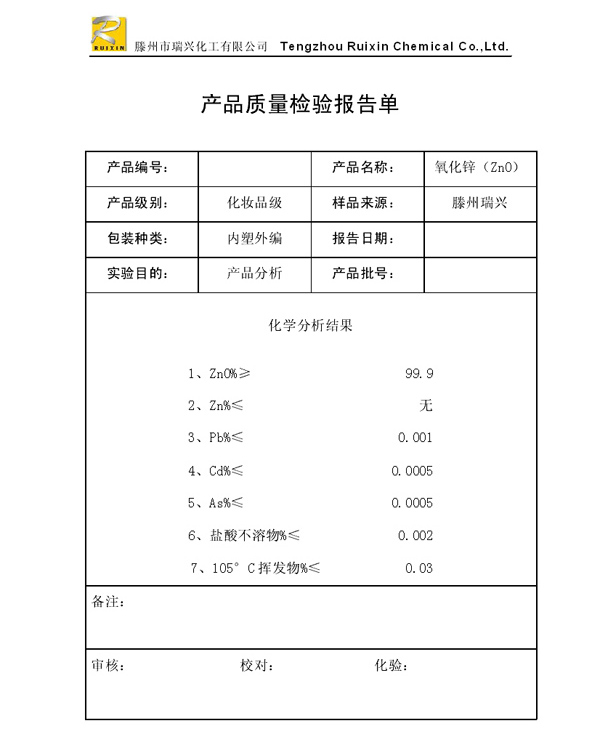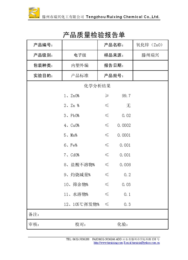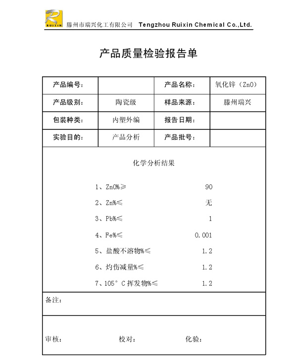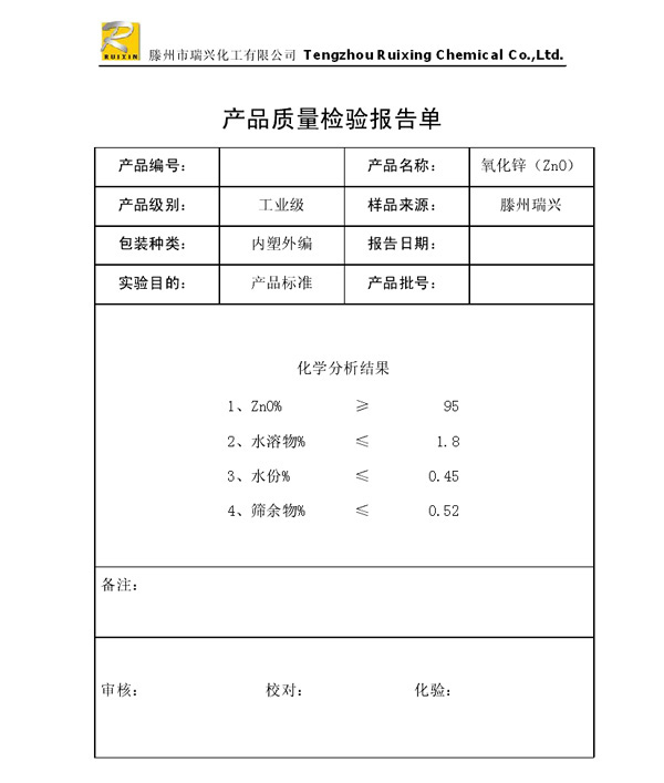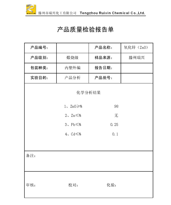 瑞興化工有限公司是生產(chǎn)氧化鋅的重點(diǎn)企業(yè),于2008年通過ISO9001:2008質(zhì)量管理體系認(rèn)證?!叭鹋d”牌氧化鋅在國內(nèi)擁有較大穩(wěn)定的市場,并遠(yuǎn)銷東南亞、中東、中南美等國家和地區(qū),在國內(nèi)外享有較高聲譽(yù)。